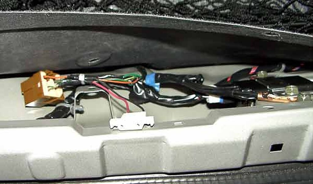 3. Locate the Multi-Remote Control Relay in the trunk. Start by removing the plastic cover above the trunk latch. The relay is the brown rectangle in the picture below: