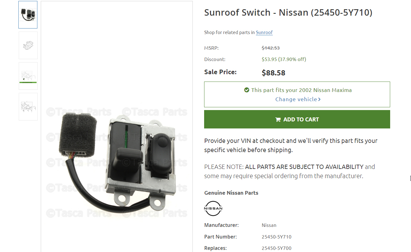 my5thgen 00-03 2002-2003 5thgen Nissan Maxima How to Fix Sunroof Tilt Function (Part Number # 25450-5Y710) 04/09/2022 Share Facebook Twitter Pinterest Email Community Member Credit: Rafael Rojas Symptoms: My sunroof was at times randomly opening on its own. Part Number: 25450-5Y710 Price: $70.00 – $80.00 ElectricalelectronicsMaintenance Prev Post 1995-1999 4thgen Nissan Maxima EVAP Canister Vent Control Valve Reference 04/09/2022 Next Post 2002-2003 5thgen Nissan Maxima Custom Short Shifter Mod 04/09/2022 Related Posts Hidden Gauge Self-Test Mode on the 2005–2006 Nissan Altima SE-R 01/17/2026 Yellow Painted Custom Modded 5thgen Nissan Maxima 12/01/2025 Jaspar’s A33 Custom Modded 5thgen Nissan Maxima 11/30/2025 How to Install 2020 8thgen Steering Wheel on 2002-2003 5thgen Nissan Maxima (2025) 10/21/2025 Josh’s 2003 VQ35DE Turbo 6-Speed 5thgen Nissan Maxima 10/13/2025 KRRZ350’s Turbo Specialties Kit on a 5thgen Nissan Maxima 10/13/2025 Comments are closed.