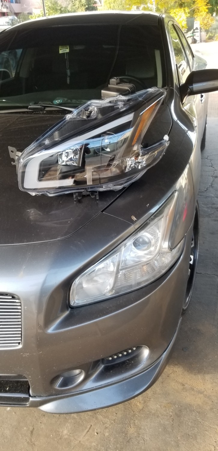 We saw these 7thgen 2009-2015 Maxima LED Light Tube Projector Headlights on eBay and wanted to capture how they look installed. They are a direct fit to your original halogen OEM lights (not OEM HID). They cost approx. $259.99 (depending on seller). The headlights come with either chrome or black housings. Not a bad deal especially if you need to replace your headlights. We personally think they look great!