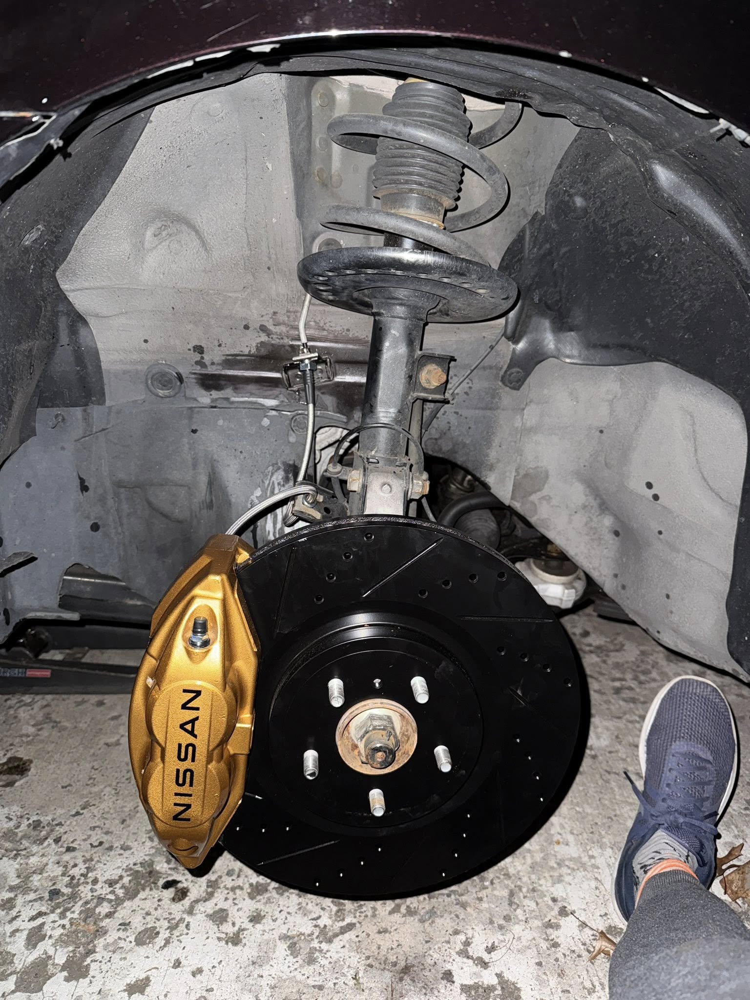 Finally got around to doing the BBK upgrade with stainless steel lines—big thanks to Roger McGee Sr. for the help. Went with R1 Concepts drilled & slotted rotors paired with ceramic pads. Also added some fresh Nissan text decals and finished the calipers in gold, which really pops against the crimson black.
