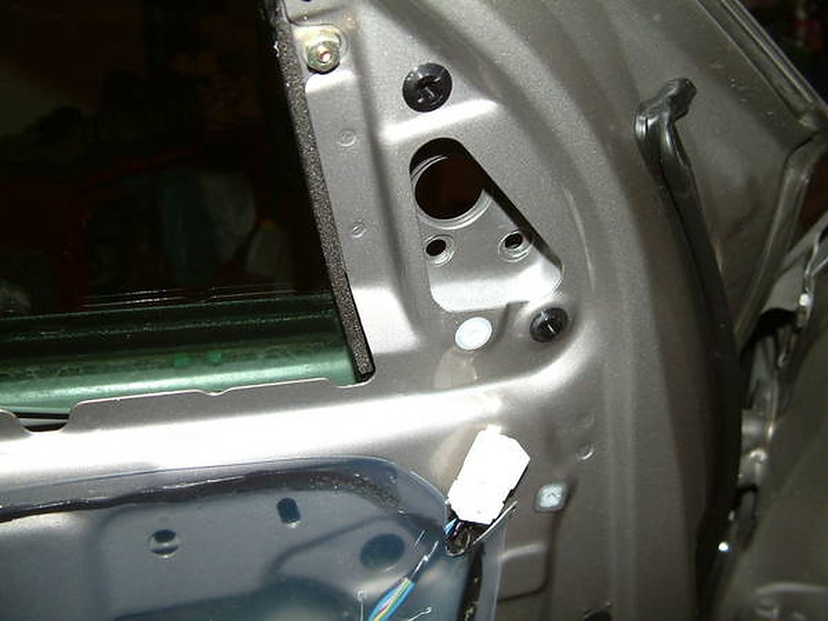 The next step is to take off the black plastic cover that is covering the side view mirror bolts (same plastic cover as seen in the above picture that the 3 wires are running into.) Unplug the connector, and take off the three bolts that are holding the mirror onto the door.