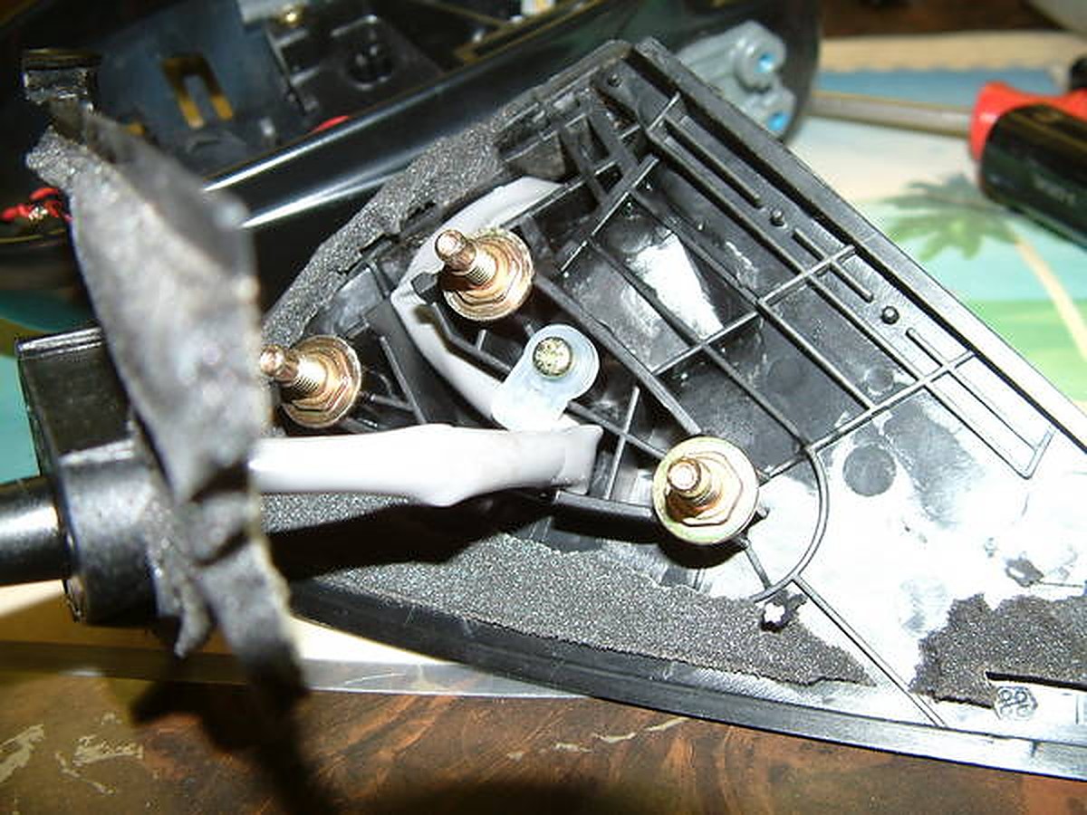 Now look at the part of the side view mirror that faces the car the part that has the 3 places to bolt onto. There is a cover on this that you have to take off. The insulation is glued on there so your going tear that. Nothing you can do about that. Look below how I tore mine. Unscrew the thing that is holding the wiring harness in place.