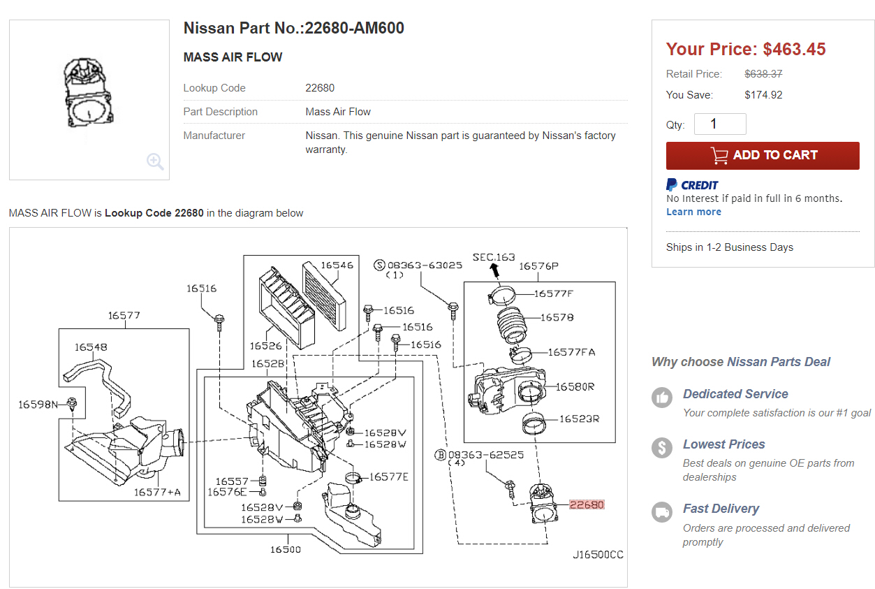 Wanted to make this reference post for folks that have MAF (Mass Airflow) issues and want to get an cost effective OEM replacement. I have to give credit to TallTom who gave me the idea to try this out. There are various aftermarket options out there but are known to have issues. OEM is the best replacement brand for MAF sensors. The main problem with buying from Nissan is the OEM (Part # 22680-AM600) heft price which is usually around $400 bucks (yeap insane).