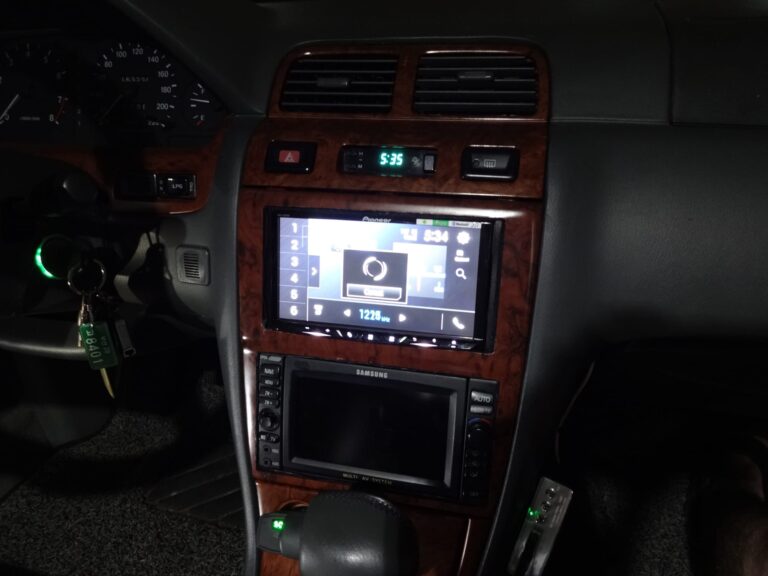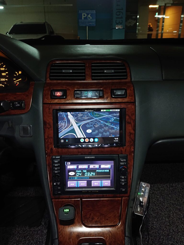 Finally a dual headunit-ish set up on factory nav system equipped 1998 SM525V (based on A32 platform)! Factory nav unit can play audio CDs and has auxiliary stereo input in front so I can use it as CDP and aux interface since it is connected to Pioneer AVH-Z5050BT via DIN 8pin to RCA adapter.
