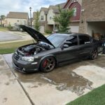 The car is equipped with version 2 tires, size 235/40, on both the front and rear. It has been lowered using Manzo springs. The rear fenders are rolled, while the front fenders remain untouched. There is minimal rubbing in the rear, which can be resolved with coilovers and camber arms.