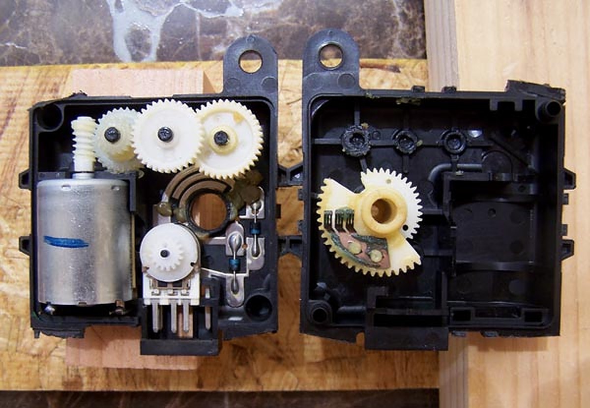 Here is the Air Mix Door Motor opened up. In the left half, about the middle, is a small gear. It is mounted on the PBR. If you look on the right half, there is a white half gear that has some metal fingers on it. The metal is copper and you can see green corrosion on the fingers. That corrosion is why your motor doesn’t work.