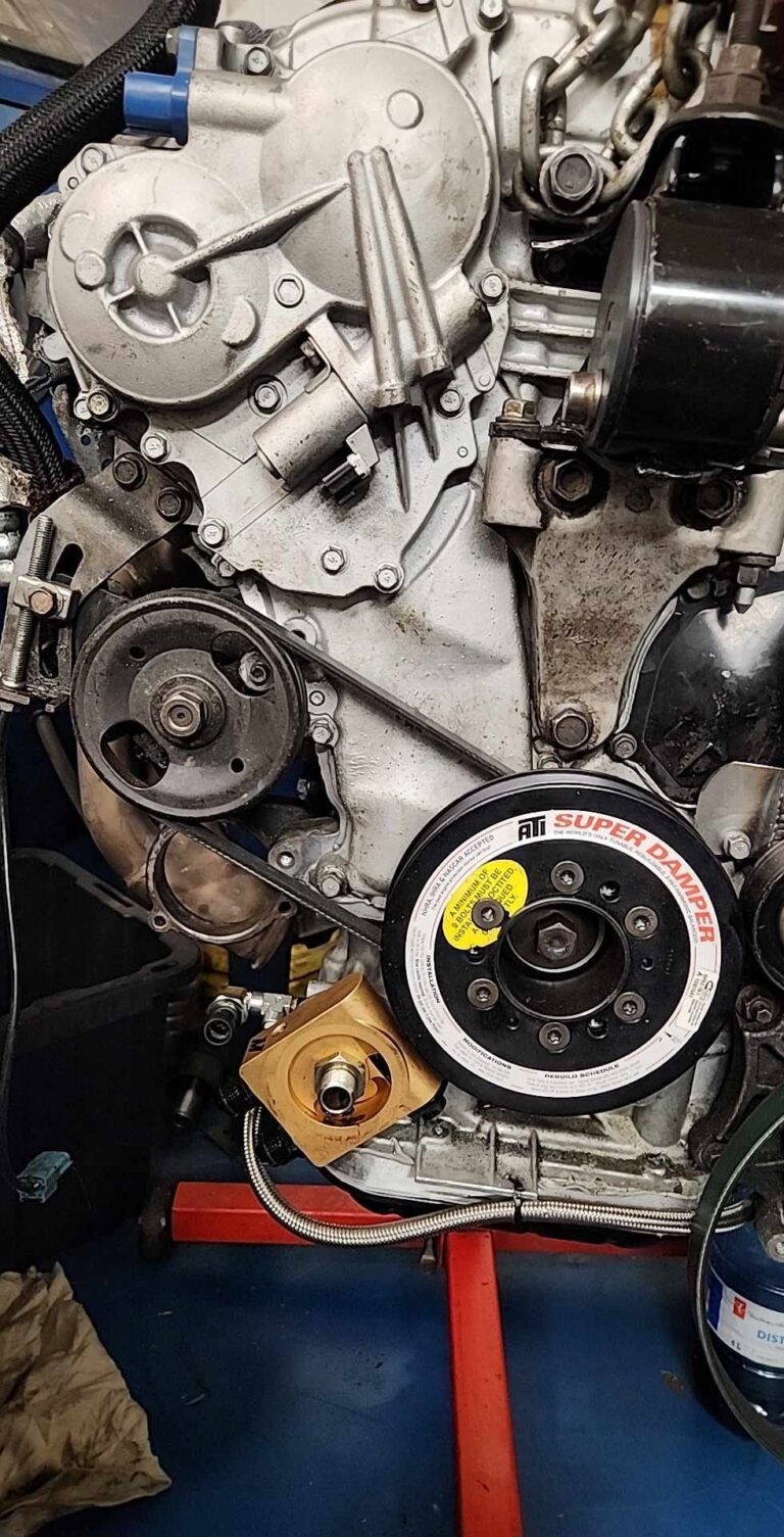For anyone who uses or has figured out the ATI damper [machined to fit FWD offsets], the belt size is 1/4″ to 1/2″ shorter than stock. With an HR swap, you must ensure that the power steering pump can move the full range on the adjuster. If it does not loosen to the bottom, you haven’t trimmed the new power steering pump ear enough on the HR inner timing cover.
