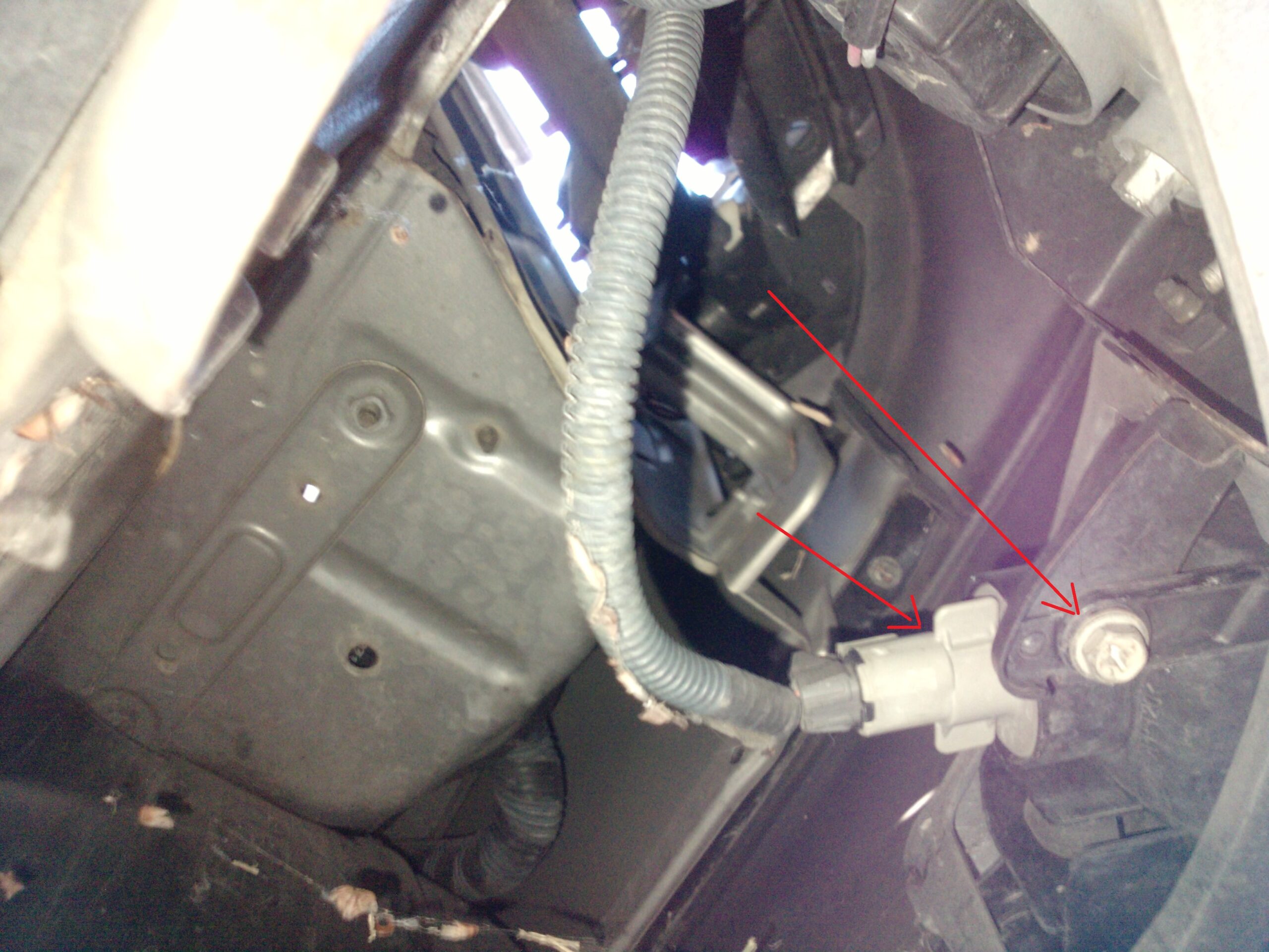 Do exactly the same with the passenger side. Everything will be about the same, except that you will have to take the glove box out to pull the wires all the way to the driver’s side. Take out glove box is pretty easy. There are two screws under the glove box and four on top. Take it out, push all the wires through to the drivers side. By the way, you might want to take out the driver’s side wall. I am talking about the wall under steering wheel. There are two screws at the bottom, take them out and pull the wall, it should come out.