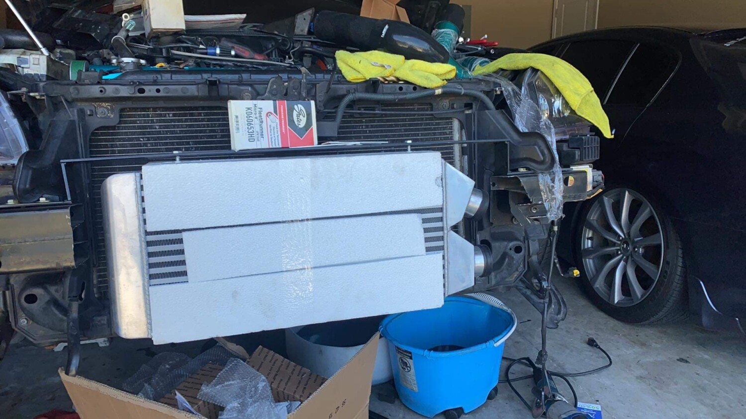 My plan was to place the turbo in the location of the AC compressor and remove the compressor. I mocked up the physical turbo to check the spacing in that area and I decided to put the turbo higher near the grill. Part of the reason for the new position was because I did not want to keep using a scavenge pump; the turbo would require one due to its low position.