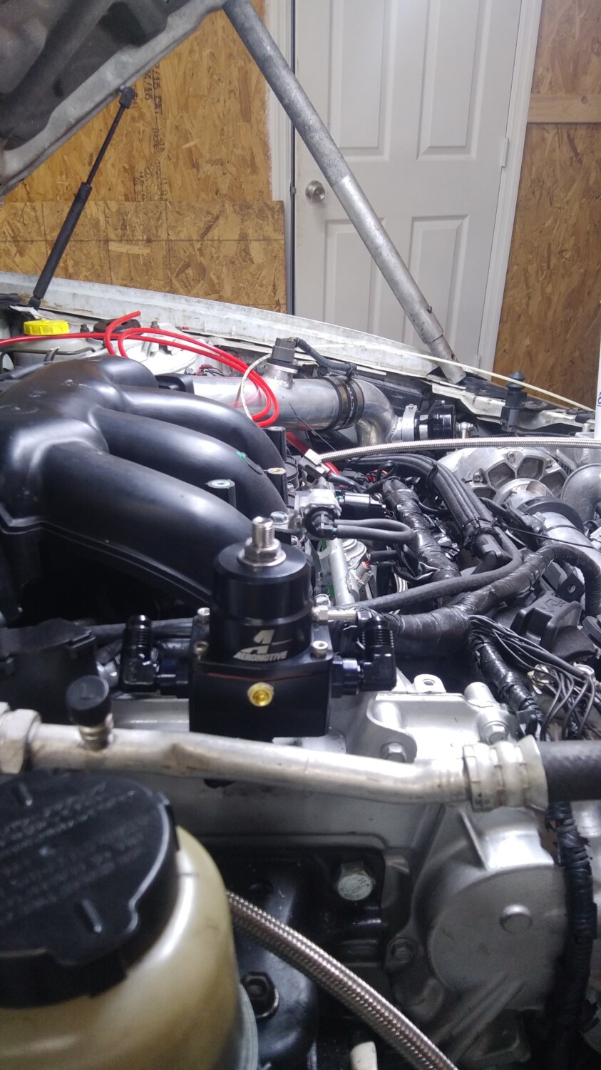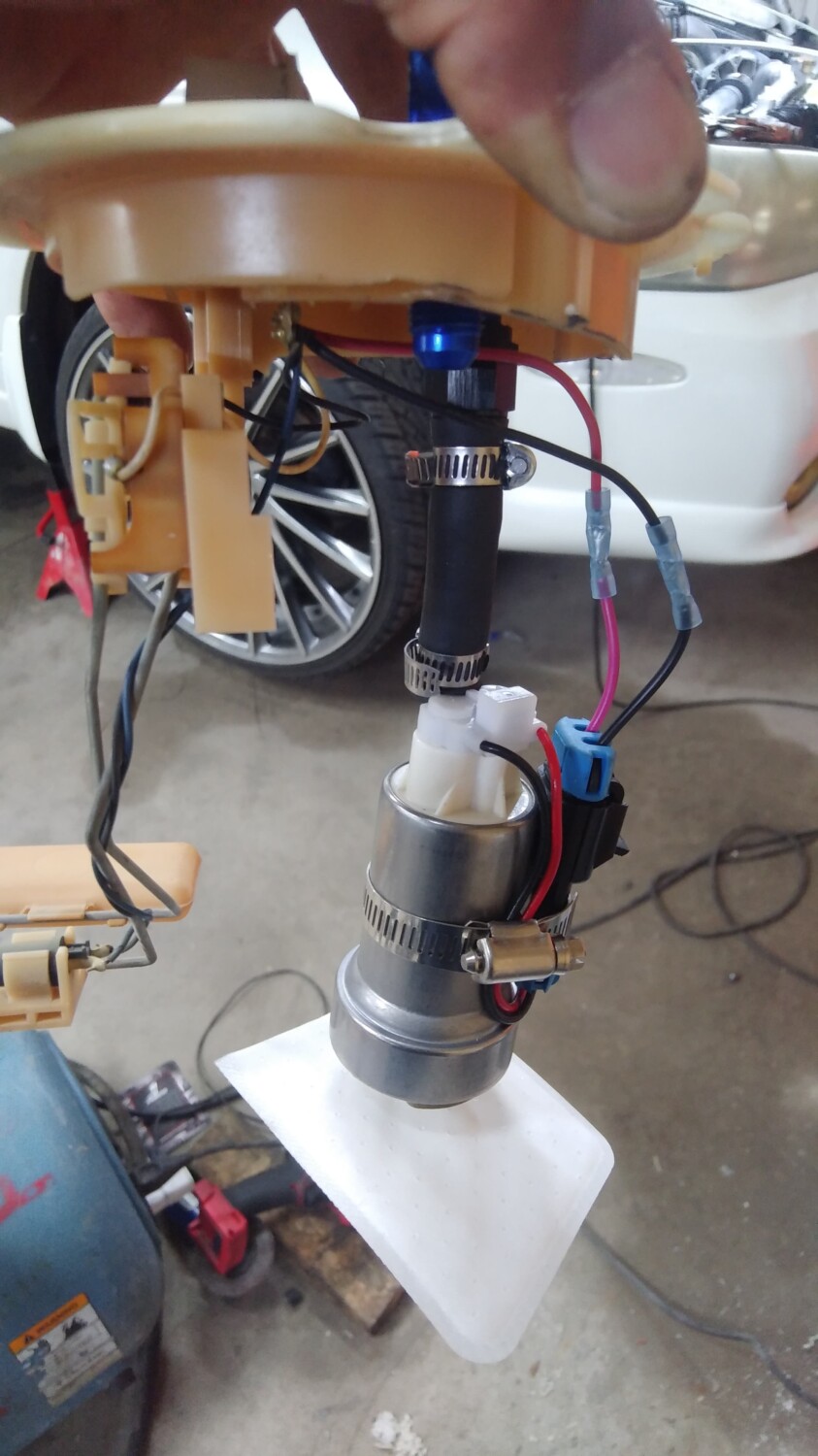 Not sure if this has been visited before but my Son recently brought it to my attention when we were discussing running a 200 shot of spray. He suggested that I use his nitrous test kit to ensure the fuel pressure remained constant when running a 200 fuel jet. So after a few minutes I soon found out that my 190 Walbro dropped to 30 psi, not good. He then mentioned that a lot pf VW and DSM guys rewired their fuel pump with a higher gauge wire to maintain a higher voltage. I measured the voltage at the pump with the engine running and found it to be just over 12v. I then ran a heavy gauge wire from the battery and conected it to the pump wire at the pump, the voltage went up to almost 14 and the fuel pressure went up by almost 10 psi.