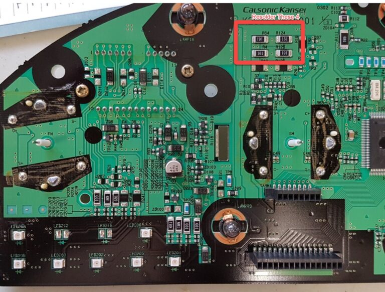 If you choose option 3, you will need to resolder the joints on the four resistors below. Over time, the joints to the board can crack causing intermittent or permanent issues with fuel readings. Resoldering the joints on the 4 resistors should solve the problem of the fuel gauge reading too high.