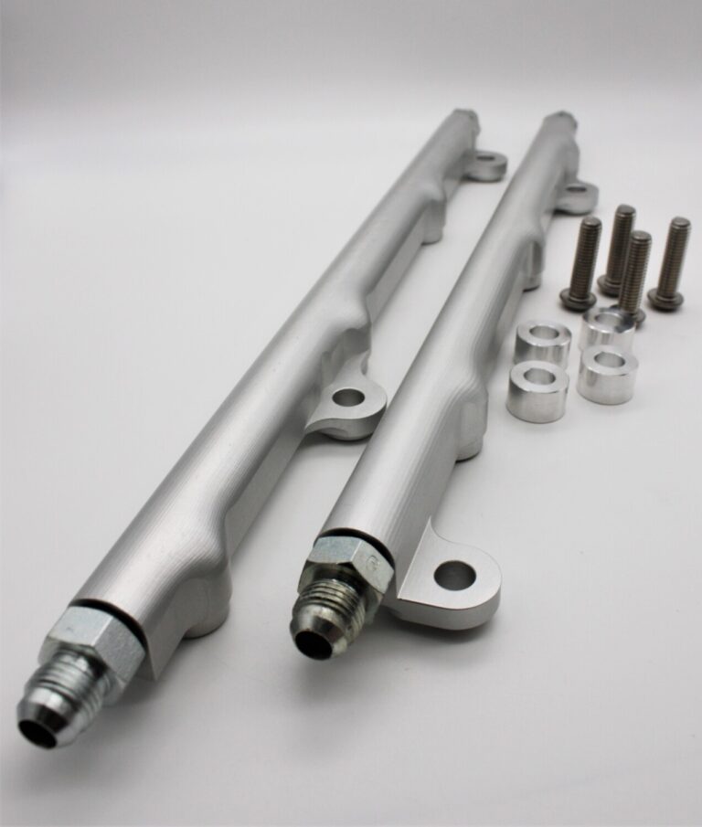 Our 350z Fuel Rails are machined from billet T6061 Aluminum stock. The rail has a larger bore diameter than stock, allowing fuel flow to increase 350% more over stock (as seen above). The rail comes clear anodized to help protect against the elements. The rail is tapped to accept dash 6 fittings. Our rails are unique in the fact that you can either use your stock injectors or use taller aftermarket bosch style injectors to upgrade your fuel system. The rail comes with four dash 6 O-ring to dash 6 AN fittings, aluminum spacers to allow use with either style injectors, and stainless button head hardware.