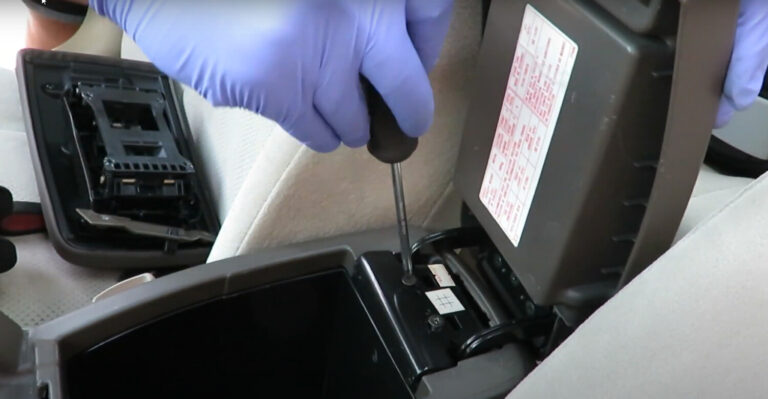 The first step is seat bottom removal. There are two latches that secure this on the lower front portions of the seat bottom in the middle of the left and right seats. Pull forward on them and the seat front will pop up. Then, while lifting slightly upward, pull forward and the seat bottom will come out. These latches are here: