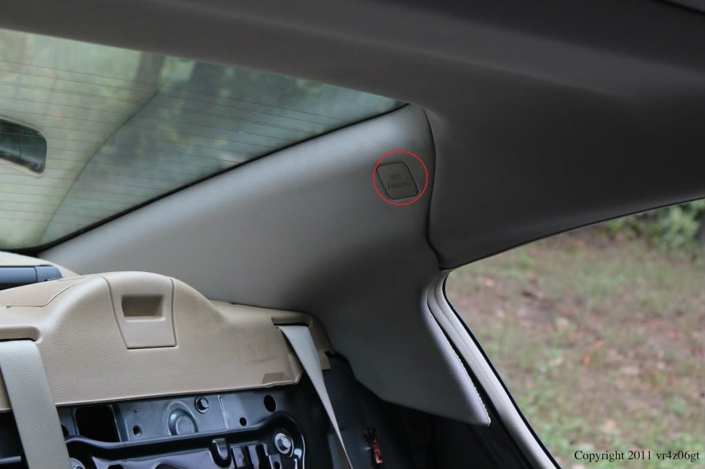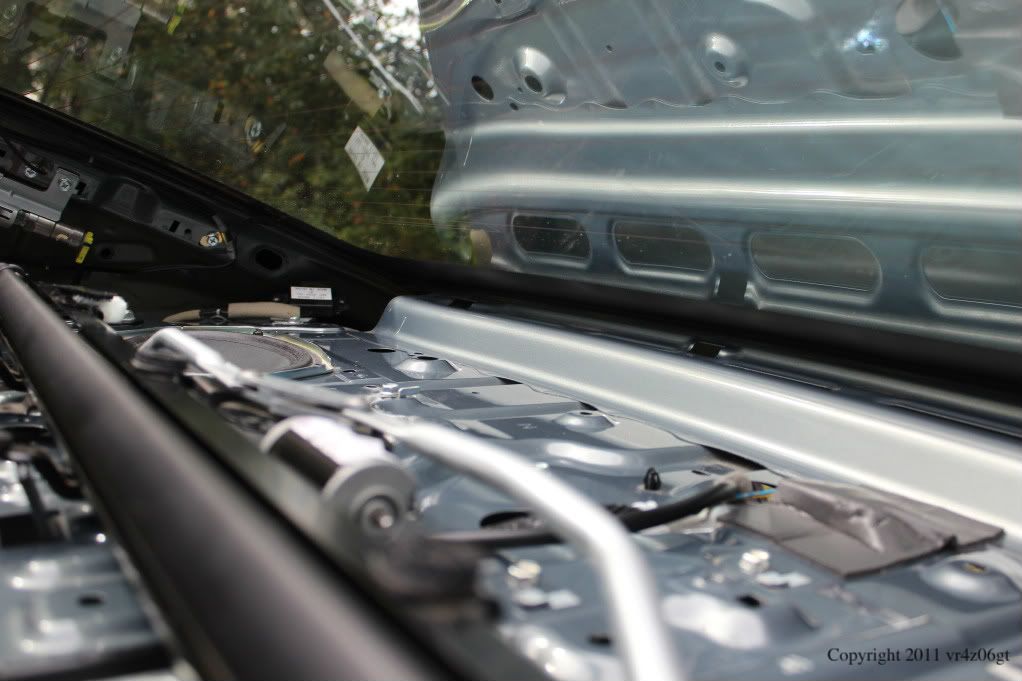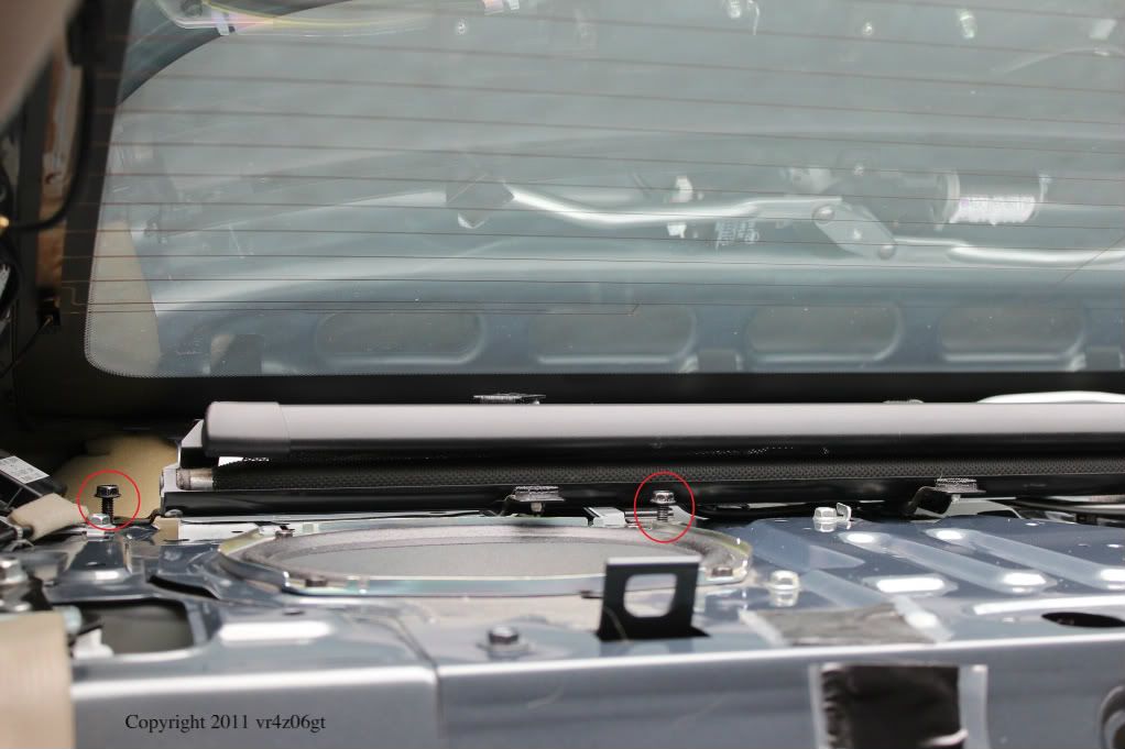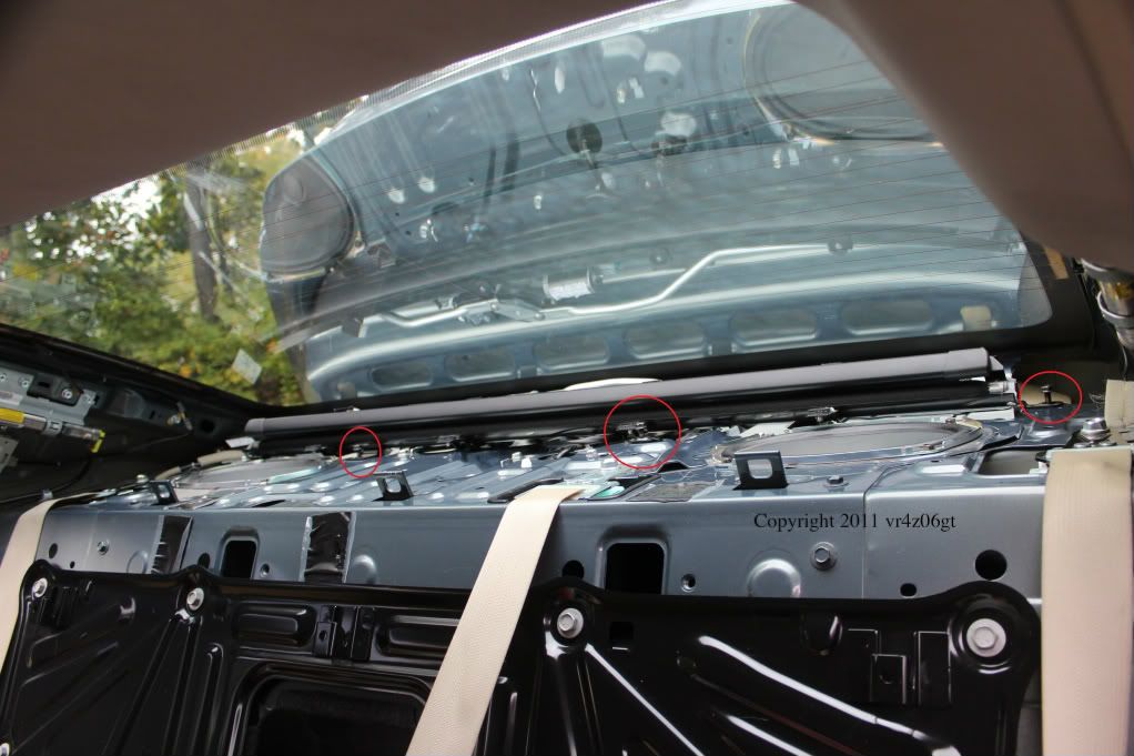 The next step is C-Pillar trim removal. There is one bolt for each piece located behind the SRS AIRBAG tab. Use a flat object, like a flathead screw driver and carefully pry it out. It should just pop out as there is nothing really holding it in. Then using a 10mm deep socket, remove the bolt. The rest is held in with push pins and slides into the rear of the deck liner. In the front pull towards the middle of the car until you hear a pop. Then slide the trim piece toward the front of the car and the trim should come out with little effort. Then repeat on the other side.