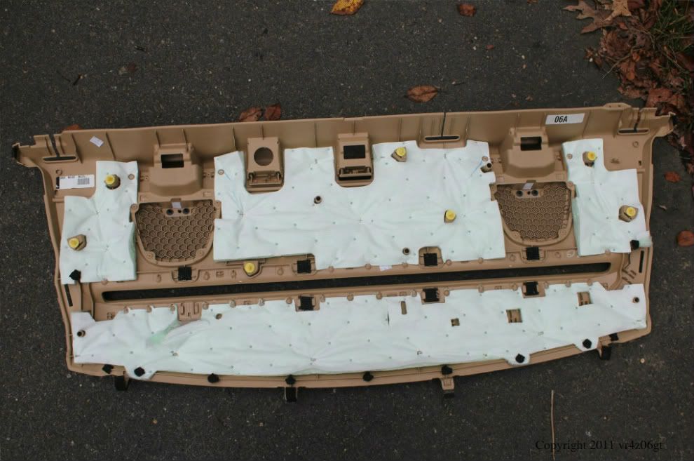 Finally you can remove the deck trim. There are 7 yellow push pins. Just stick your hand in there and carefully separate them working from one side to the other. I have a premium package so I have the rear sunshade. There are 8 Velcro style grips that secure this to the rear of the deck liner. I noticed one of mine stayed on the sunshade bracket and came off of the deck liner. I recommend that you put it back on the deck liner as it will make reassembly much easier. Once you have popped the pins off pull forward firmly but gently and it should just slide out (the Velcro will give way).