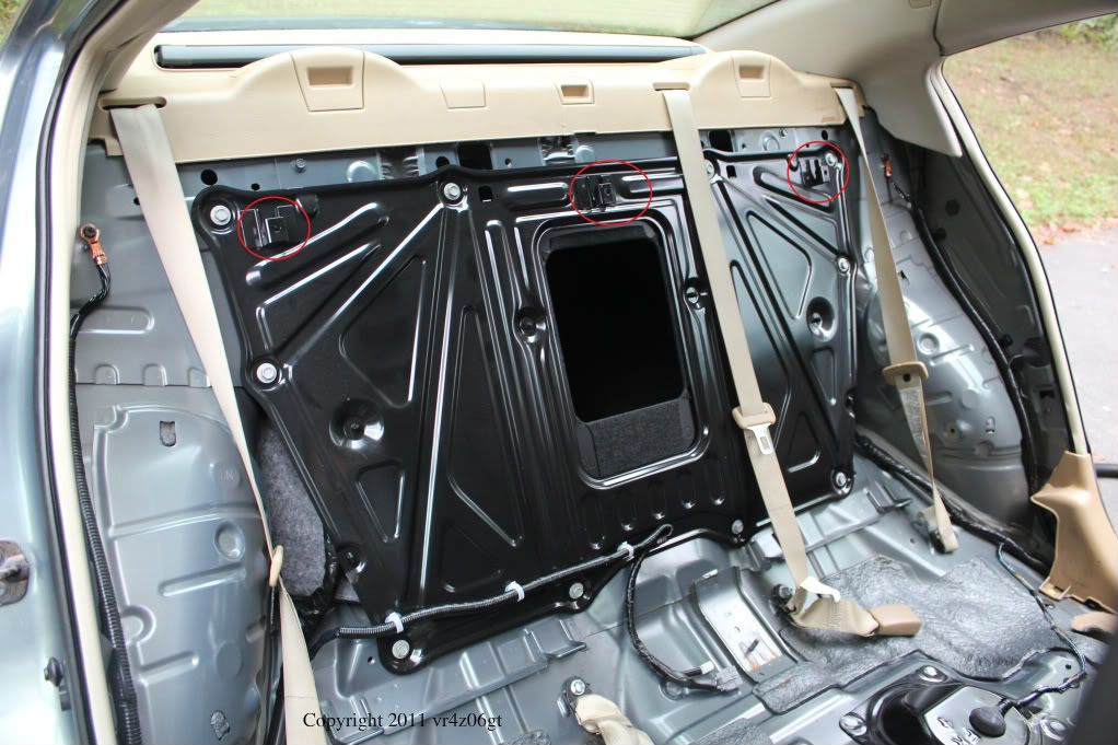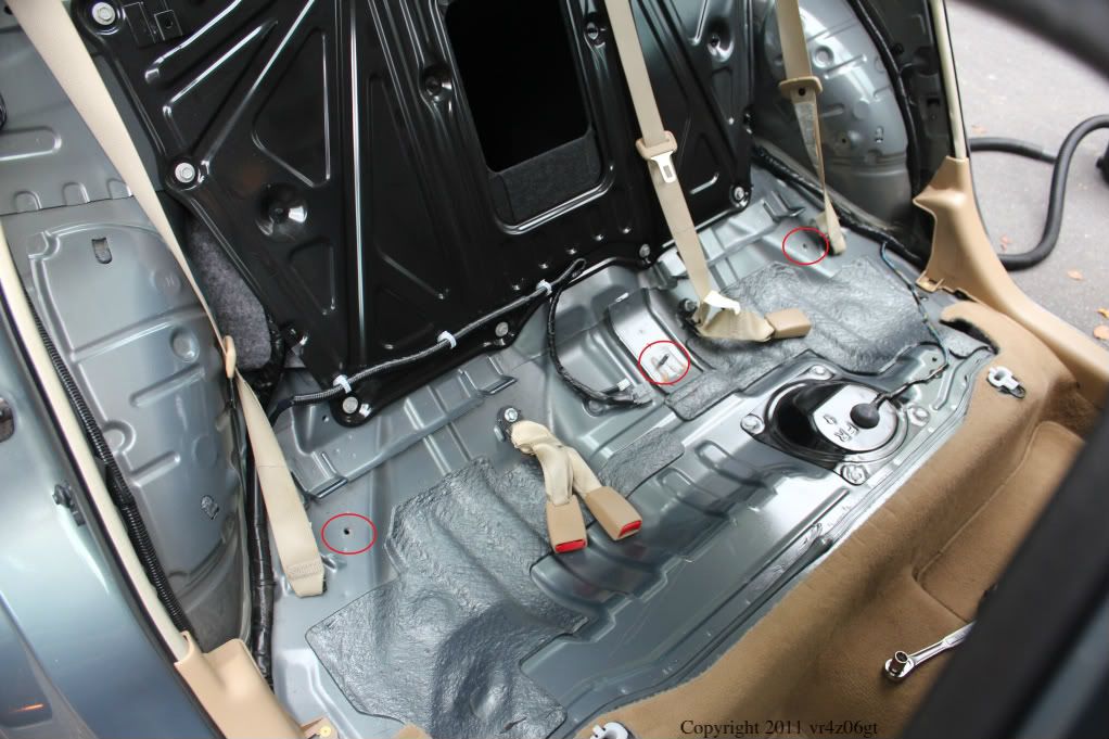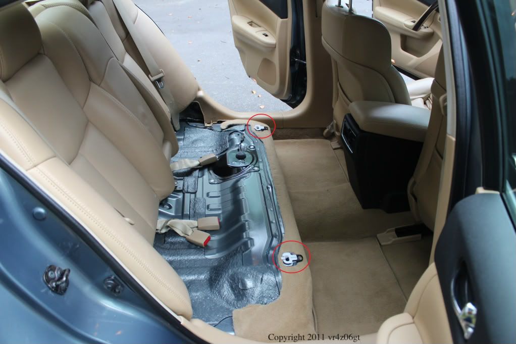 Next step is to remove the rear seat back. There are two 13mm bolts and a 13mm nut that hold this down. It is difficult to get a wrench to spin for more than a few inches without an extension, so I recommend one. The bolt locations are here: