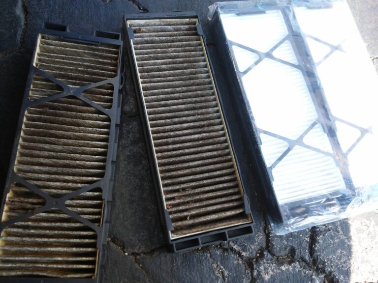 5.This side-by-side shows the stock filter removed on the left, and the replacement filters on the right. I was quite amazed at how dirty this filter got. The replacement filters come in two pieces and have plastic holders that enable them to slide into place more easily than the original filter.