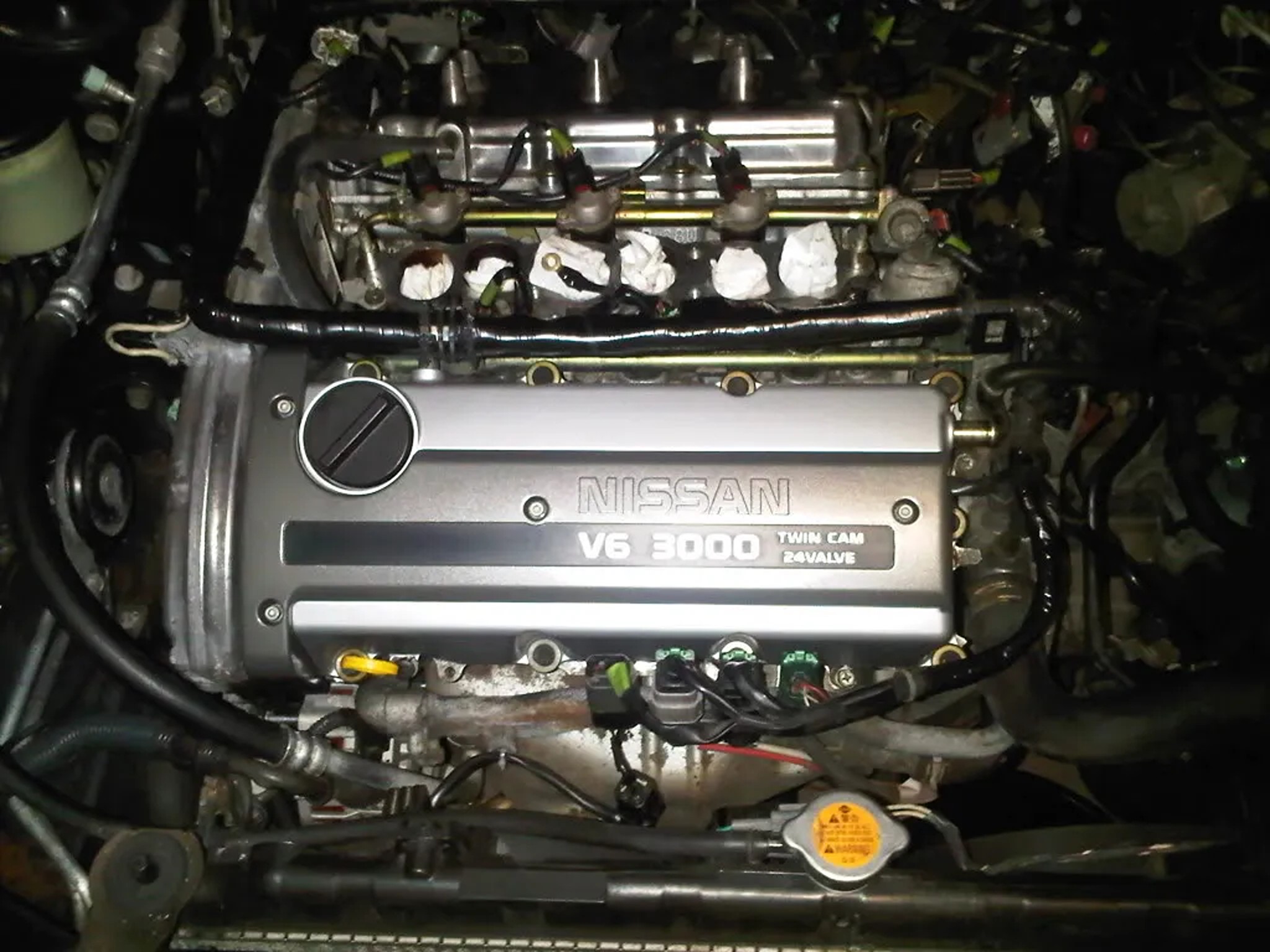 When I removed the upper intake to access the rear cover, I had to cut two coolant hoses that connect to the back of the intake. I couldn’t reach the clips, so cutting was my only option. These hoses are Nissan-only parts, so I had to wait a while to get replacements. -