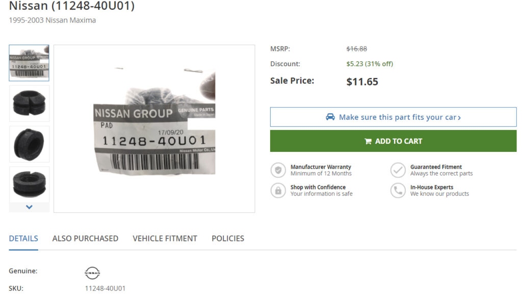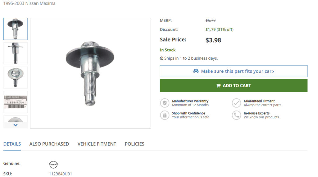 Applies to 1995-1999 and 2000-2003 Nissan Maxima. The cross-member bolts show up as two different part numbers but they are the same exact bolt. You can enter the part numbers online and order from whichever site you prefer.
