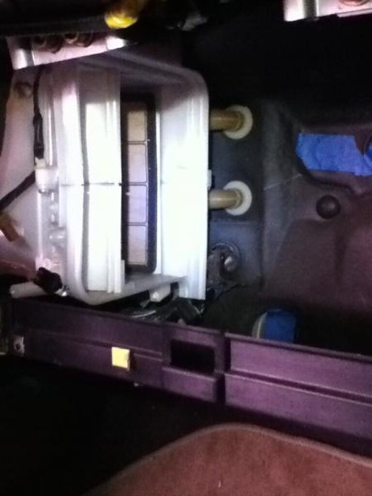 d) Expansion valve was the trickiest – remove glove box (six screws), unbolt refrigerant lines near the firewall (two bolts), remove evaporator housing (four screws), open up evaporator case (six screws), remove old expansion valve (three bolts and a bit of tape). At this point I added flush solvent to the evaporator and blew some compressed air through it. Then I replaced the expansion valve.
