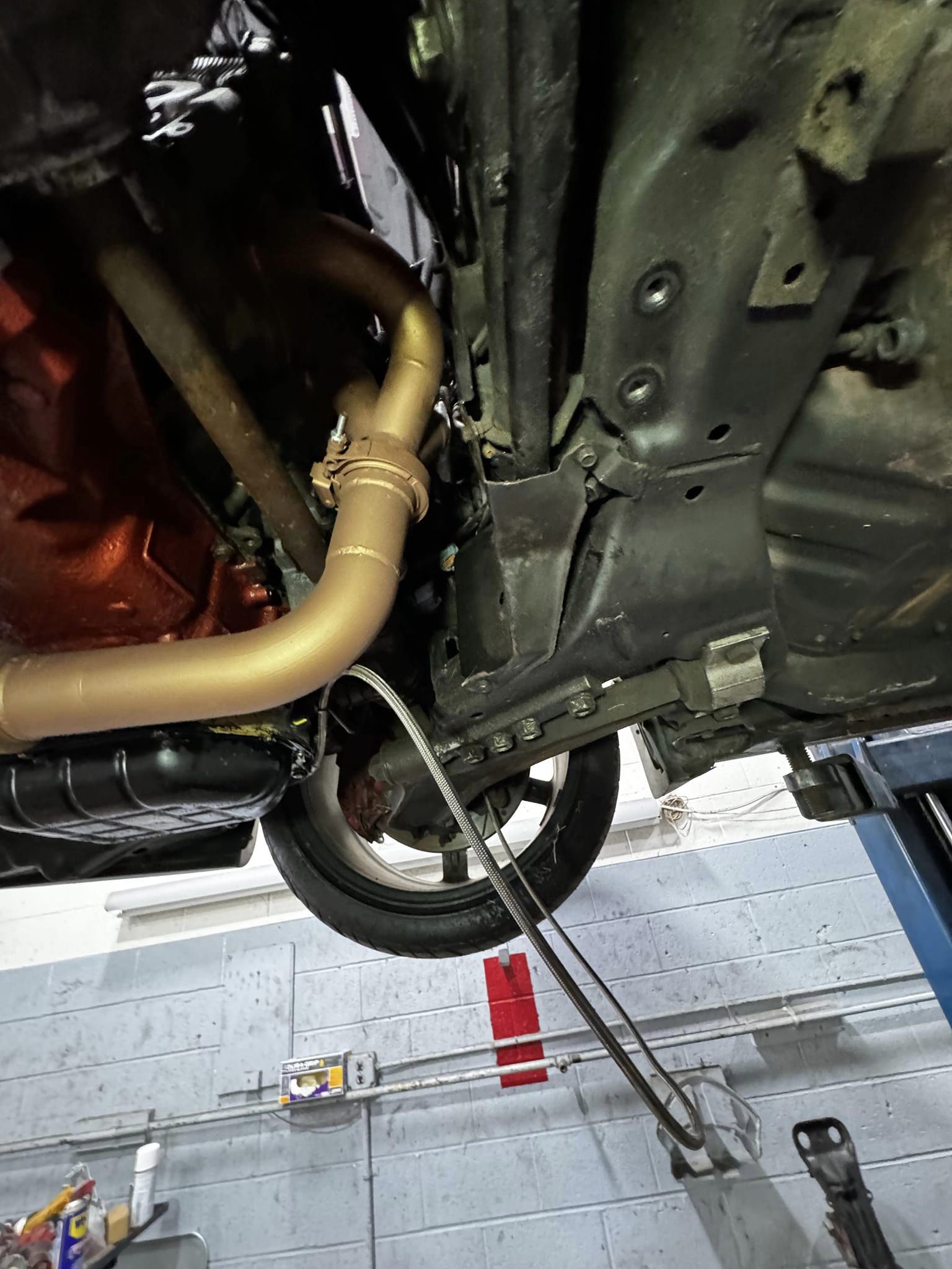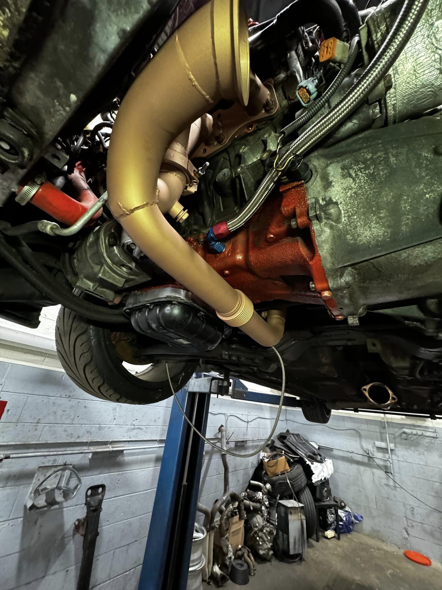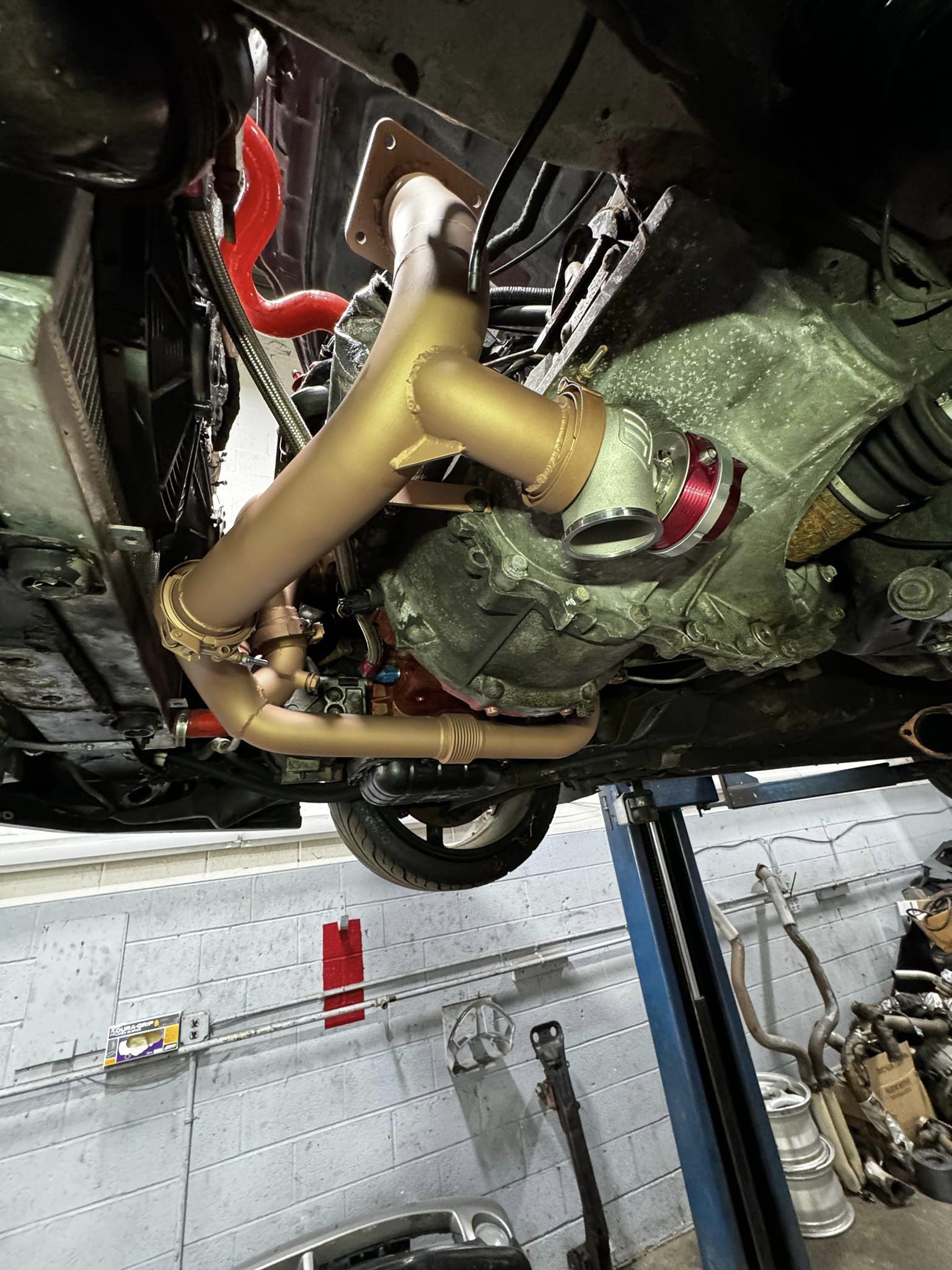 The turbo manifolds are custom built by Abdala, and wrapped in titanium to help fight under hood temperatures. The car uses two downpipes, one used for the track which is a 3.5inch short pipe that exists the hood, hence the holes in the hood. For the street, a custom down pipe that routes to the back of the car then comes out of the passenger side rear door with a custom muffler that is based on a Dynomax VT. This has baffling inside that is very quiet when there is slow airflow, once an increase in airflow occurs the flaps open and it becomes a straight through muffler.