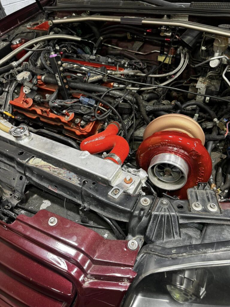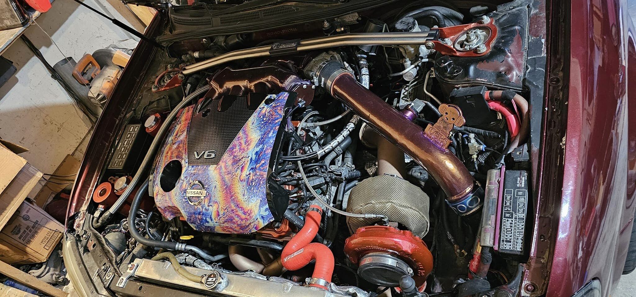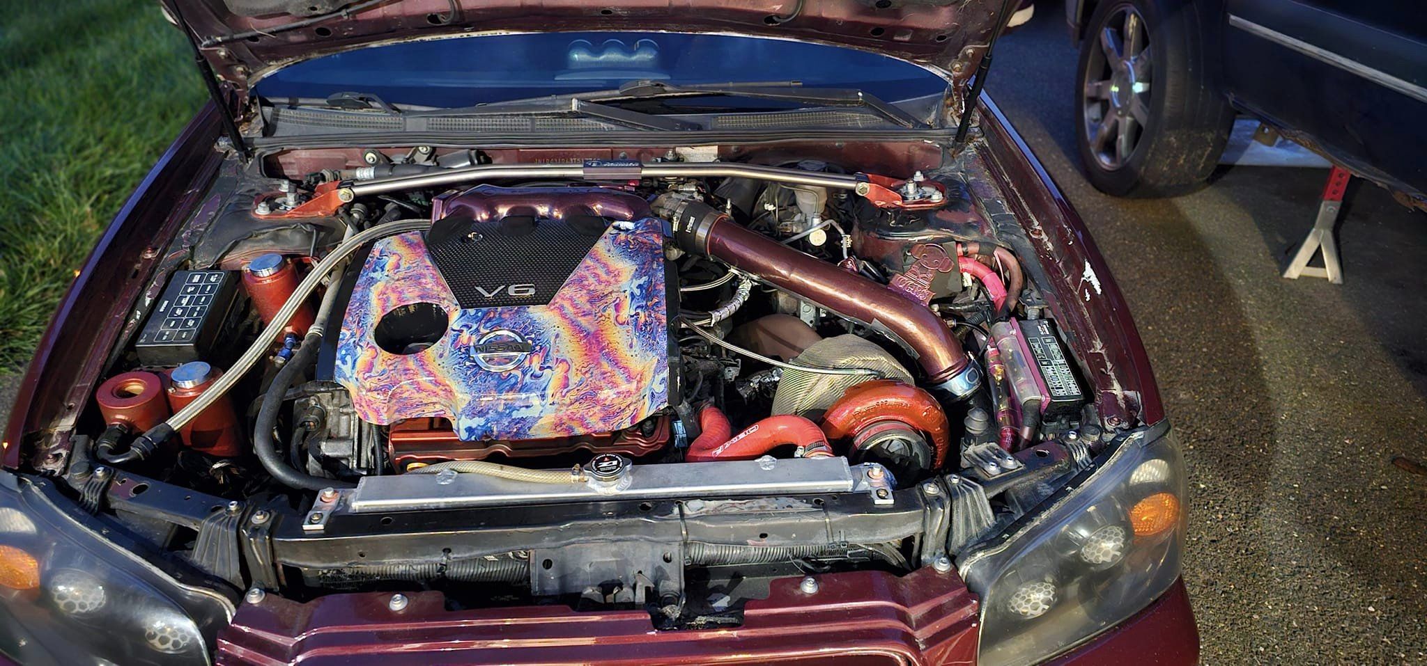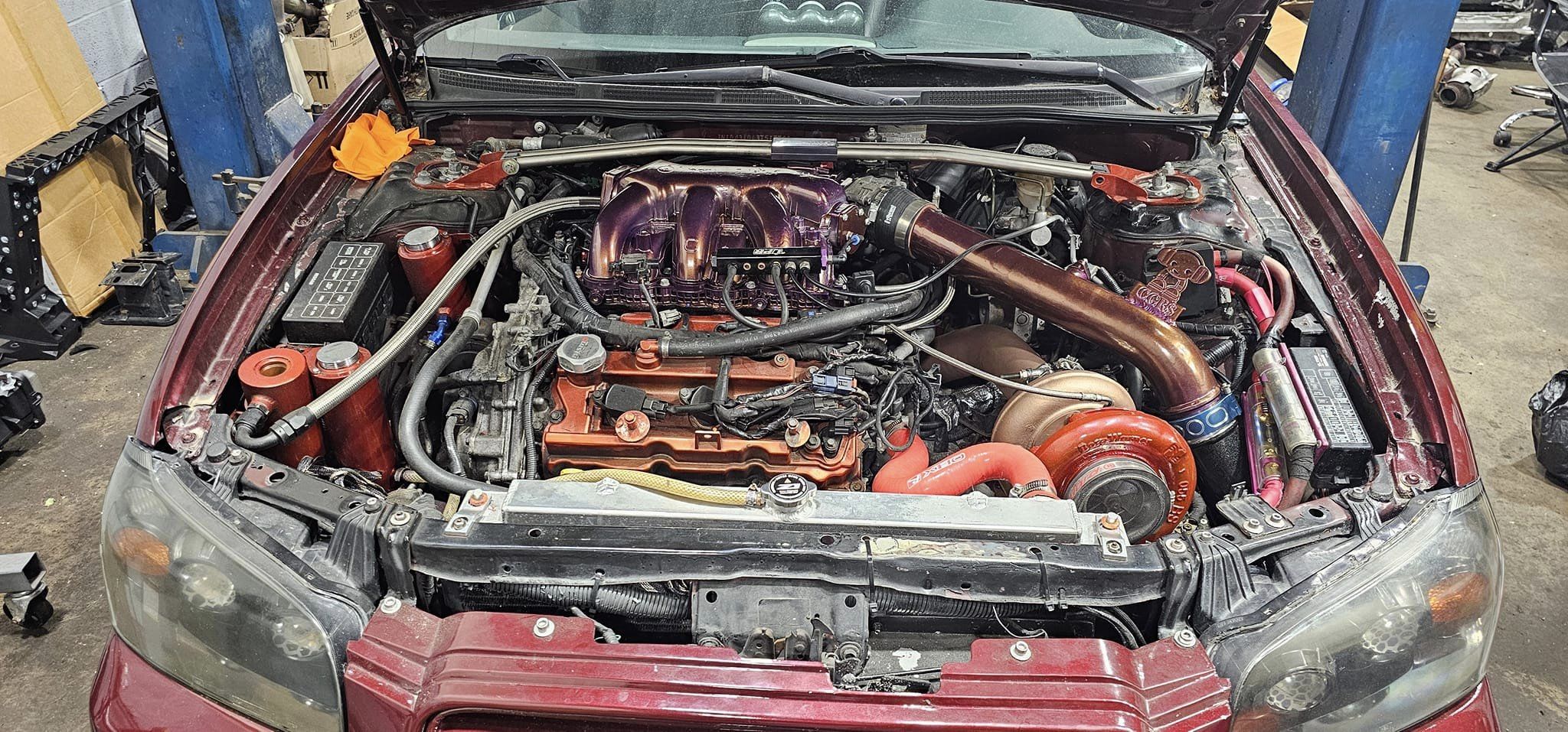 If the giant intercooler wasn’t a dead give-away, once you pop the hood you start to realize that this is a car that is very different from the stock 190whp grocery-getter Nissan designed. The engine was swapped with a more powerful and lighter VQ35DE. If that code looks familiar to you that is because it is the same engine code that you find in a 350z, just a front wheel drive version. The bottom end is built with ACL HX bearings, and Eagle H beam rods matched with Weisco 8.8:1 Pistons. A Nissan Rev Up oil pump replaces the stock for more reliable oiling, and the 3.5 block has been bored slightly to 96mm. The head bolts are stolen from a Nissan Juke, the headgasket is from a Vq35hr, the higher revving cousin of the VQ35DE. This combo keeps the all-important contact between the head and the block going strong even under relatively high amounts of boost pressure. The heads have been modified as well, VQ35HR valve springs replace their OEM counterparts and the valves have been lapped and adjusted by Abdala by grinding the buckets by hand. An NWP torque link connects the engine to the actual frame of the car, reducing engine movement.