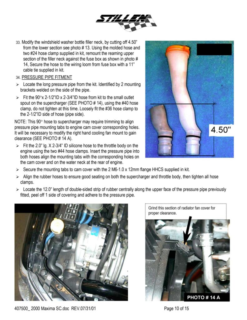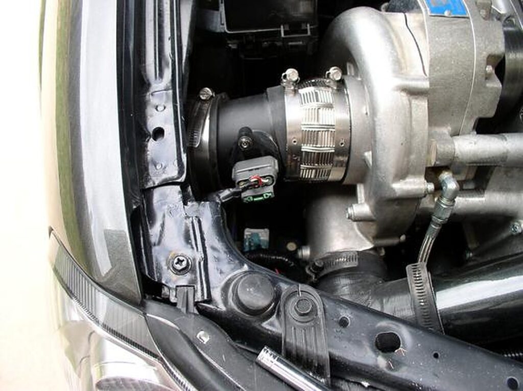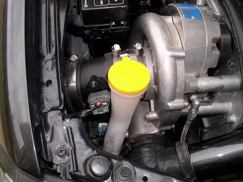 Remove the low-pressure SC pipe and cover the SC with some duck tape. (to keep shavings out of the SC) Also jack up the car and remove the passenger tire. Remove the wheel well cover and pull out the washer bottle. But first, pull out the fill neck. Just grab it and pull, it pops out (this has 2 10mm bolts that you will need to remove)