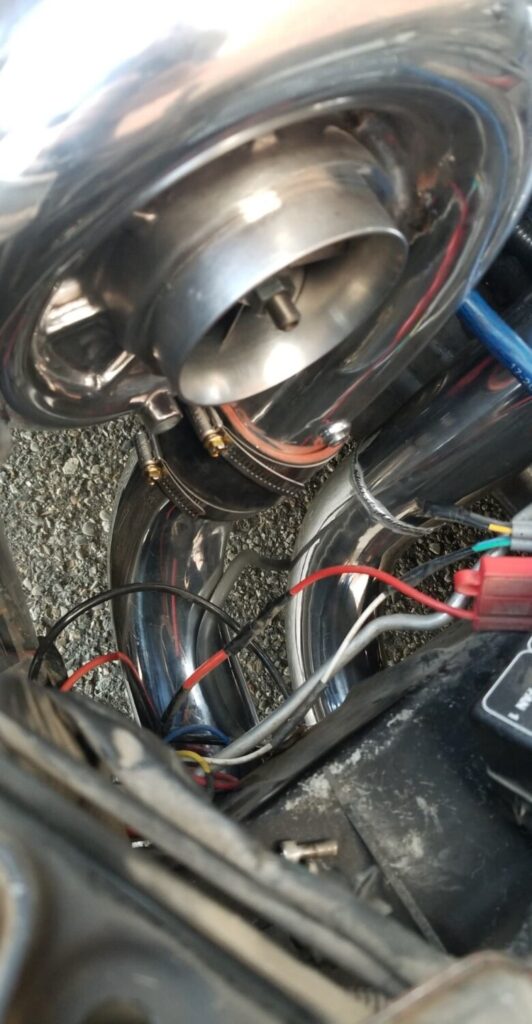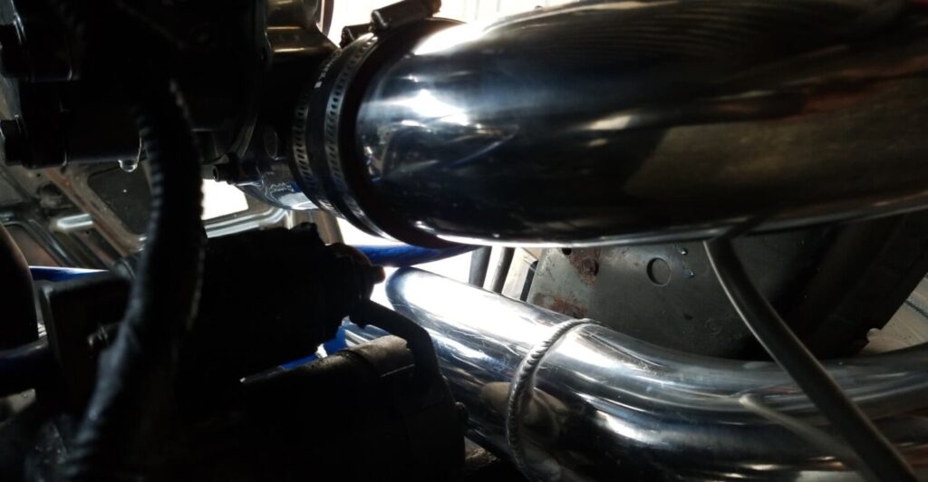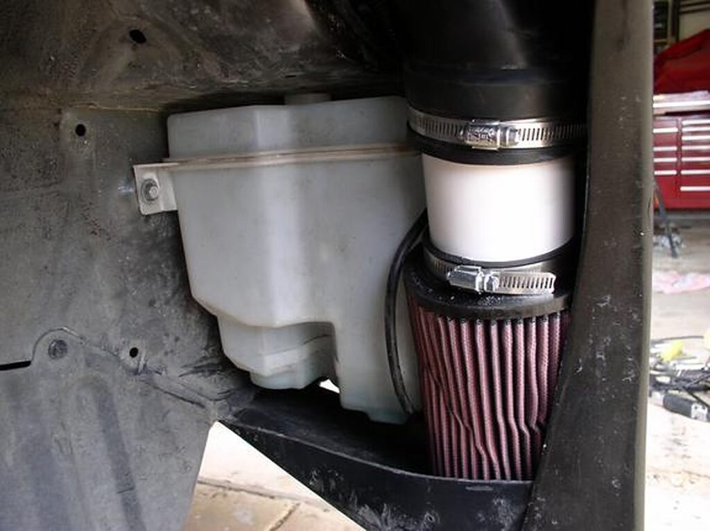 Remove the tape off of the SC and place 3″ ProFlex coupling on the SC and tighten it on there. Next, push the filter assembly thru the wheel well. Then route it so that you can place the washer bottle back in later.