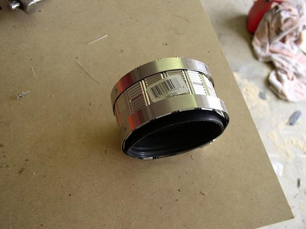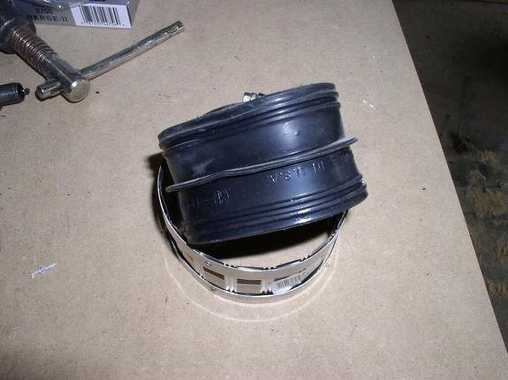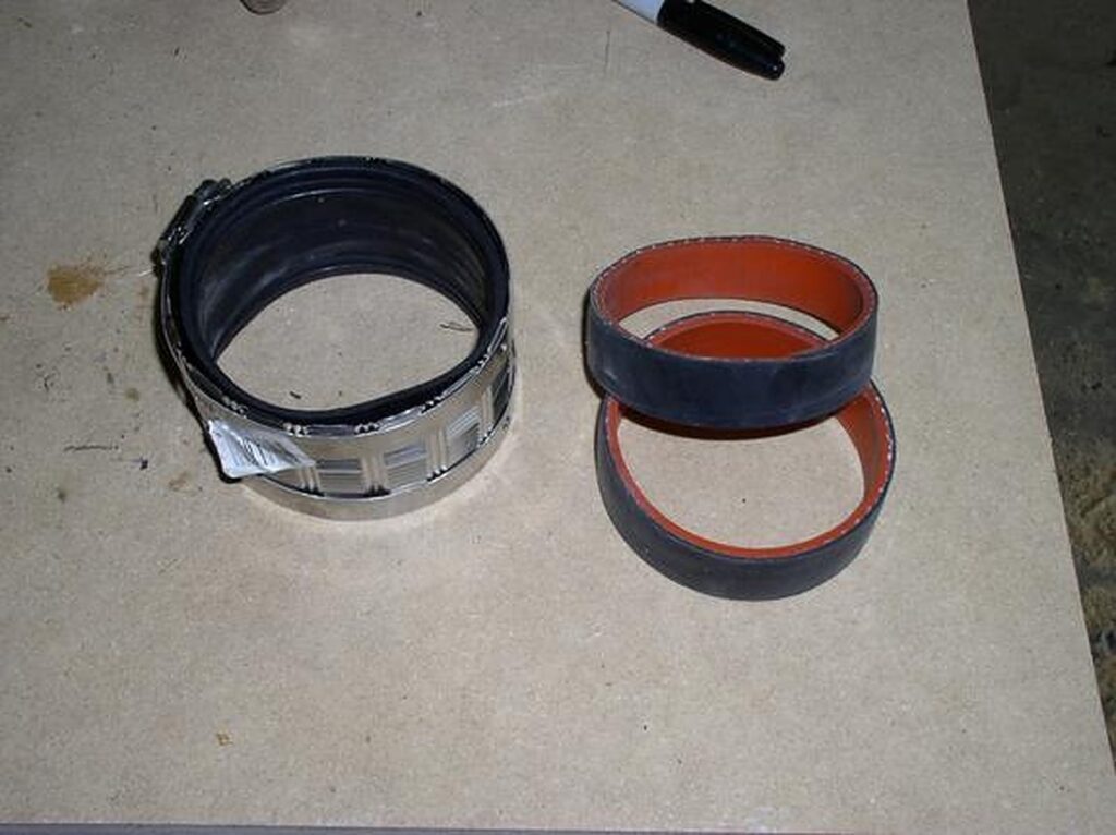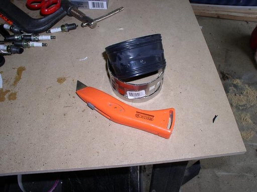 Trim the 3″ ProFlex coupling. Turn it inside out and trim it with a sharp (new) razor blade (I use a grinder or Dremel to grind off the lip in the middle).