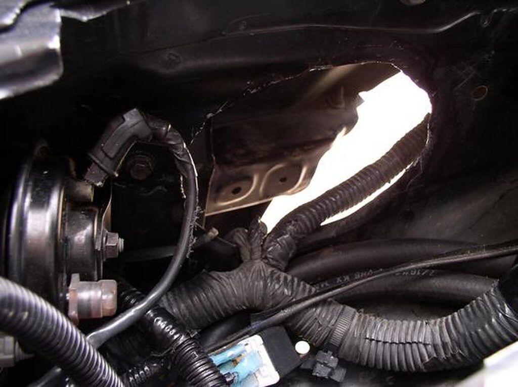 Use the MAF to get an idea of how much bigger you will have to make the hole for the piping to go thru. You will also need to cut the bracket in the fender well for clearance. (clean out all the shavings i.e.: vacuum or blow it out)